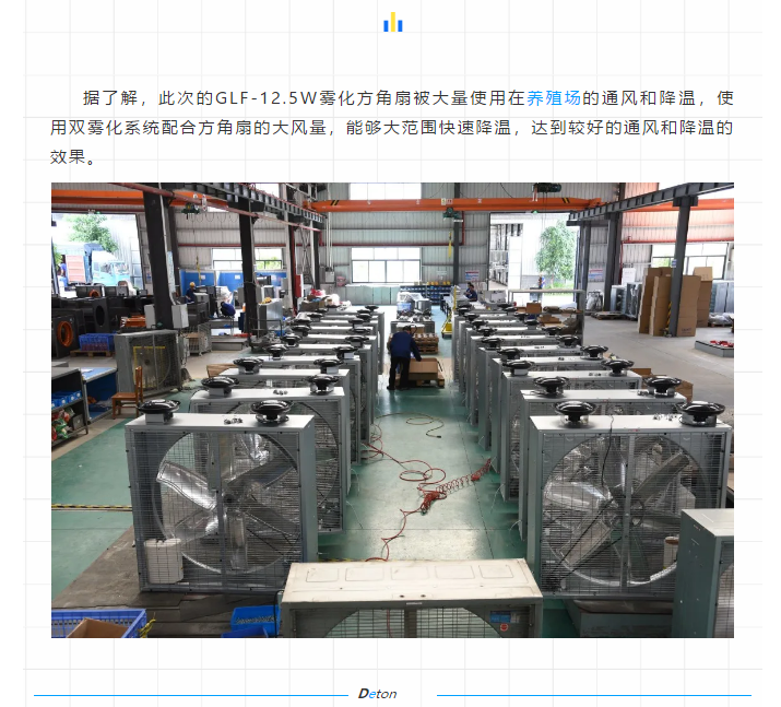 海外市場部的同事介紹,該客戶近年在德通的推薦下零散訂購了一些GLF豪華方角扇和GLF霧化方角扇用于自己的倉庫和車間通風(fēng)降溫。